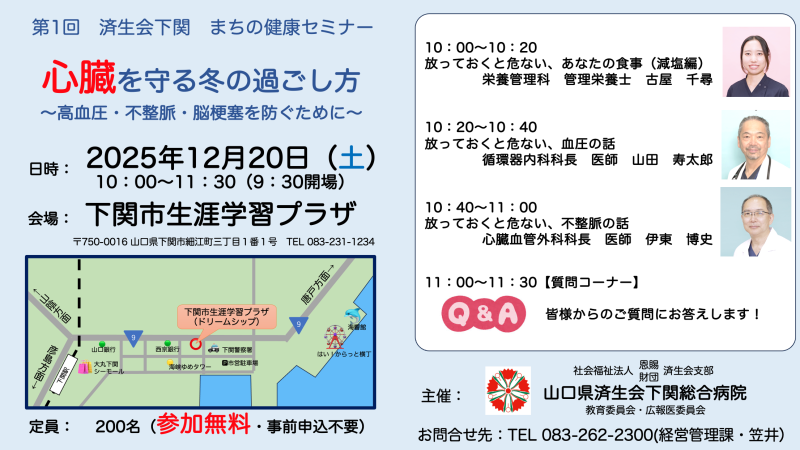 寒さが本格化する冬は、血圧の上昇や不整脈など、心臓や血管への負担が増える季節です。そうした冬特有の健康リスクについて、専門家から直接学べる「まちの健康セミナー」を、12月20日(土)に下関市生涯学習プラザで開催します。